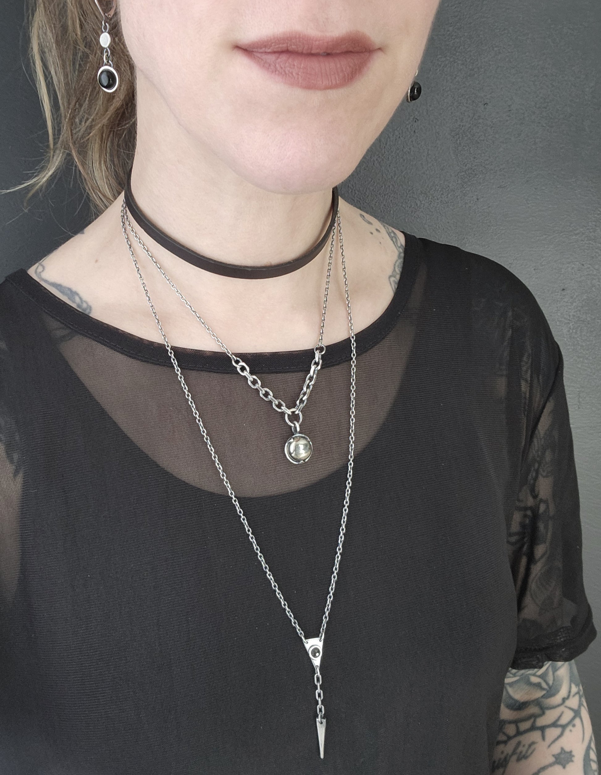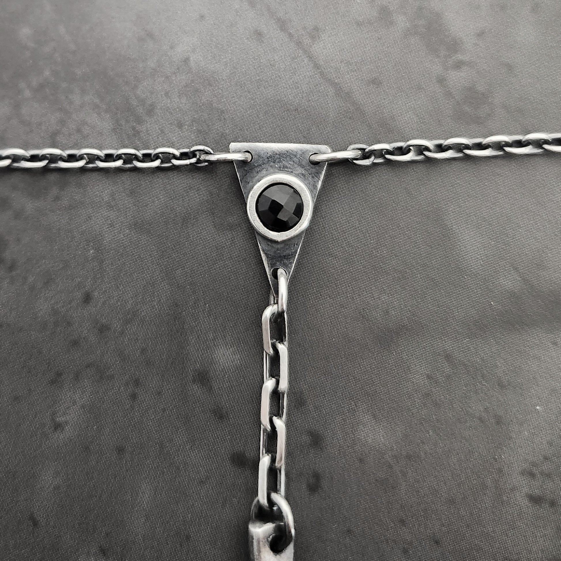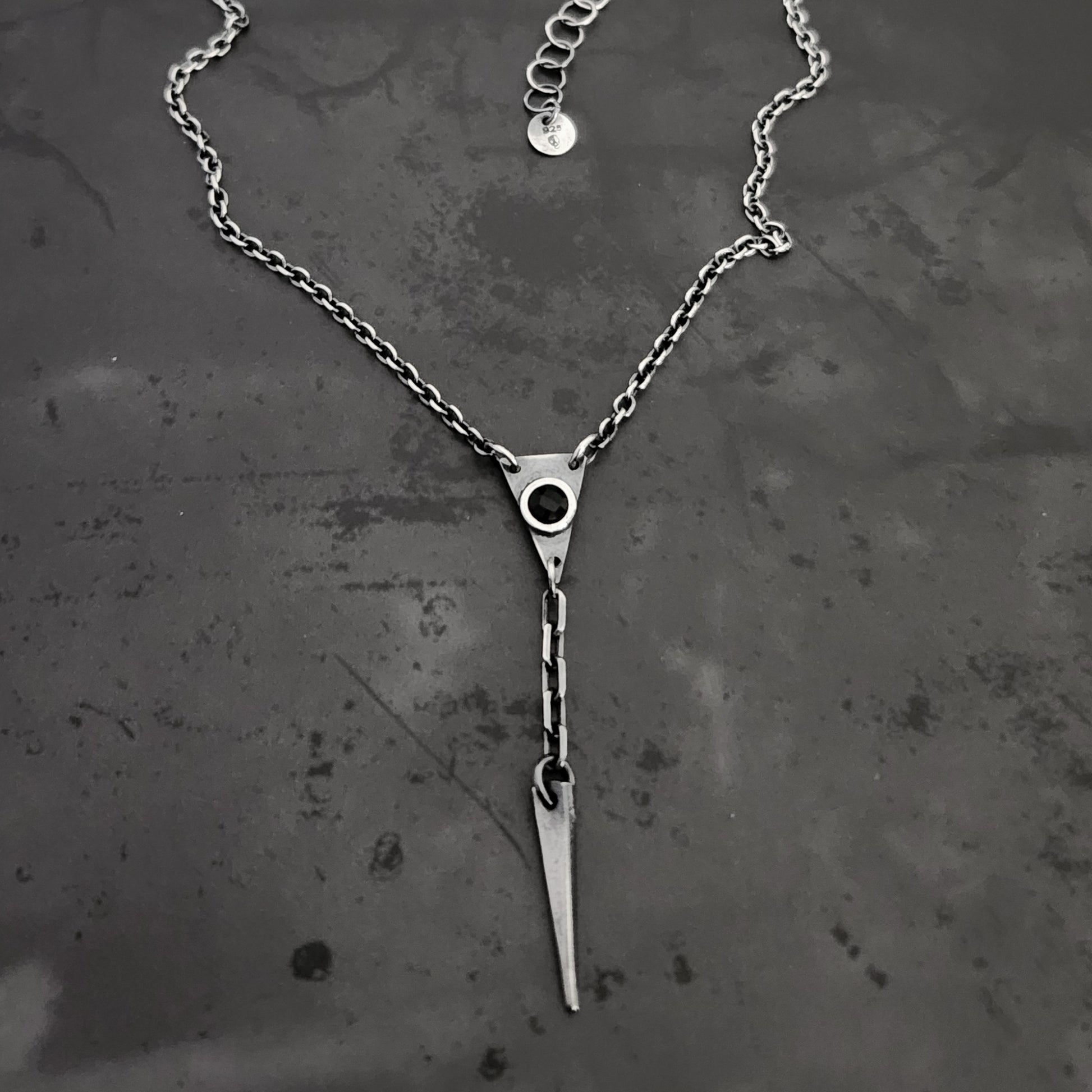 A romantic and gothic necklace with a faceted round onyx set on a triangle. A forged spike hangs on the end.