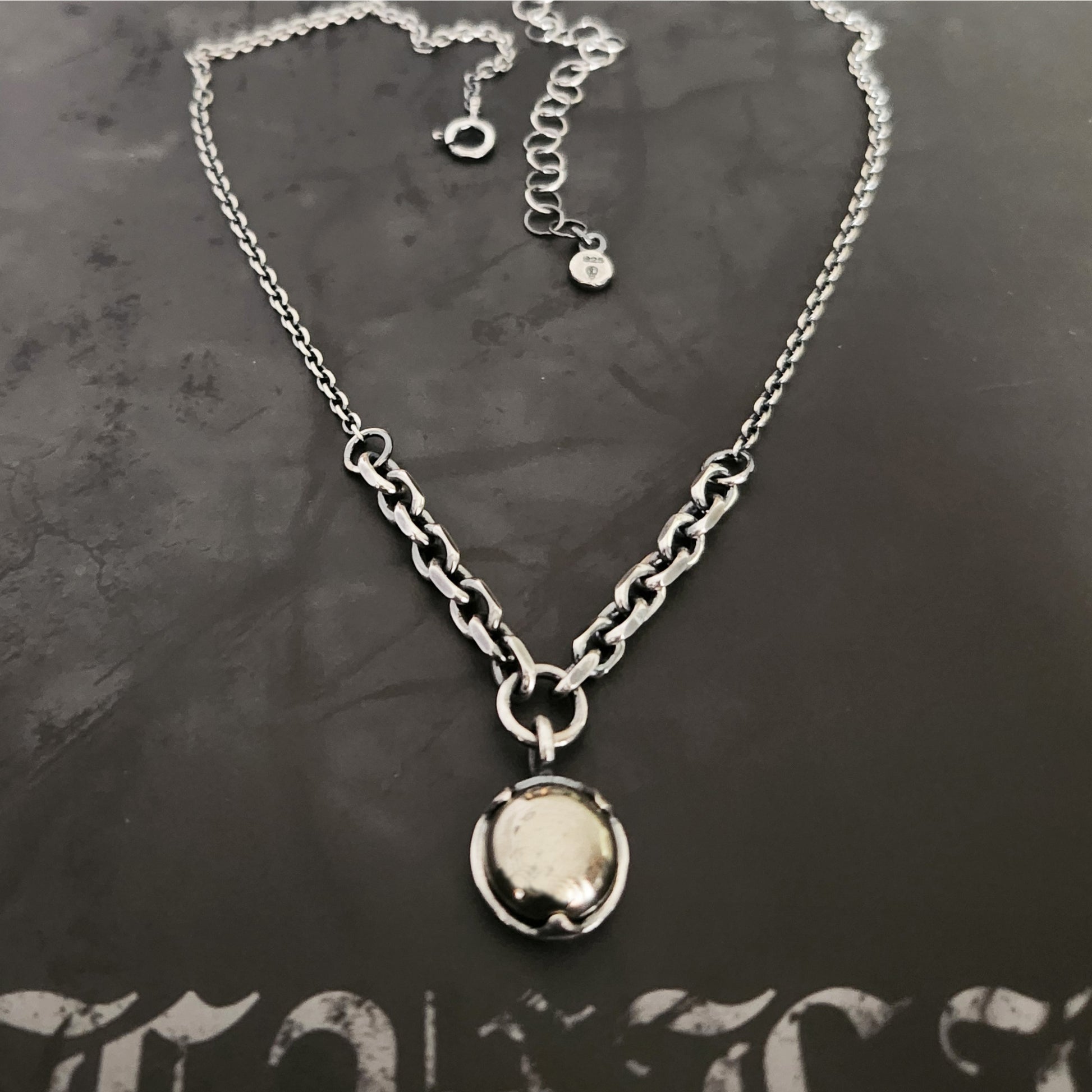 Total length of the necklace is adjustable from 17" to 20" long. The rings connecting the different chains are soldered closed. The pyrite is a smooth 12 mm cabochon.