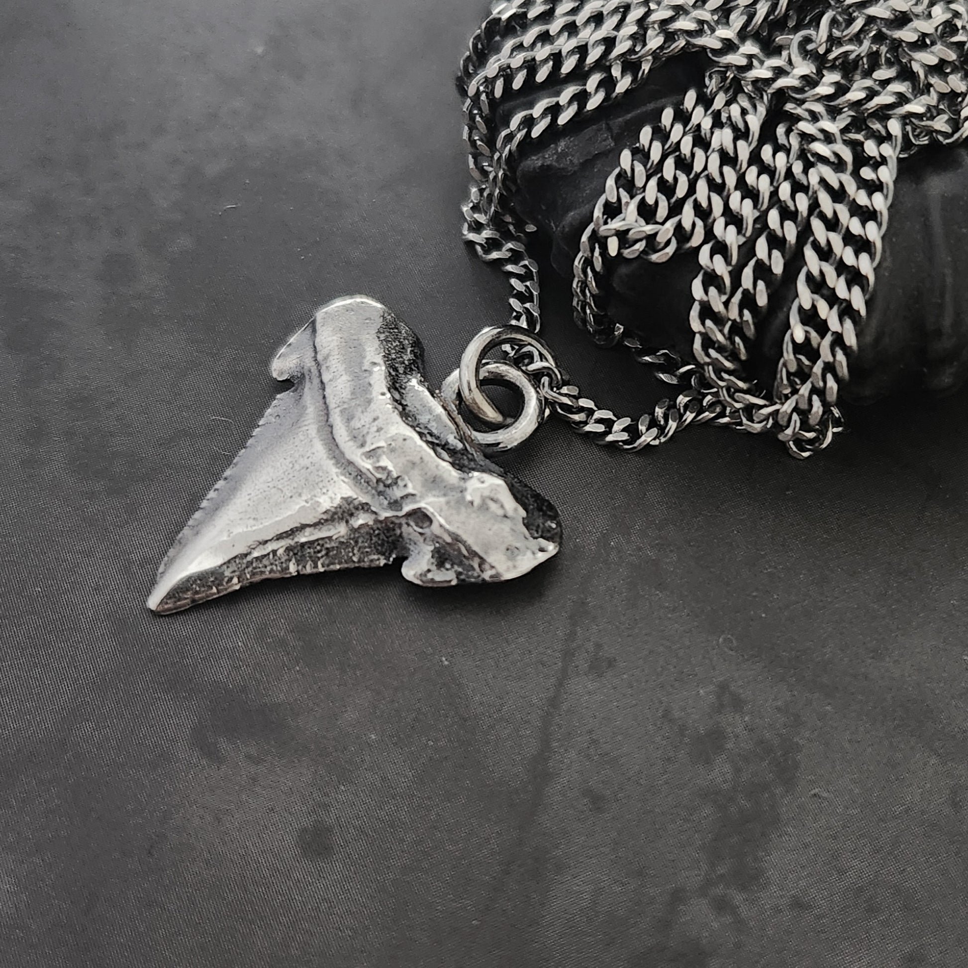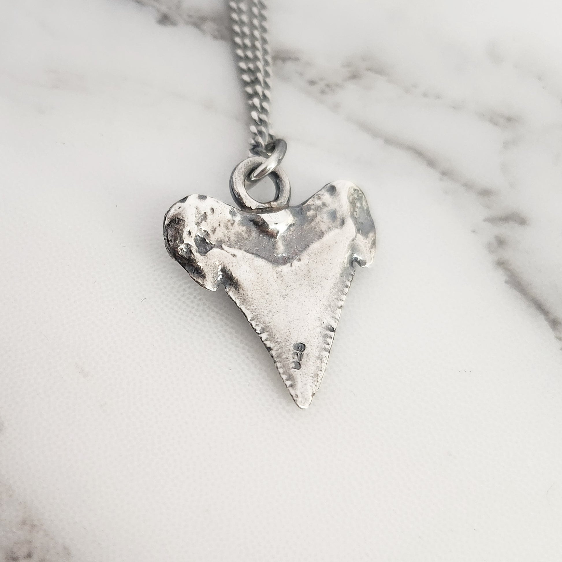 The tooth is molded from a real shark tooth and cast in sterling silver. I soldered on the ring and the jump ring for the chain soldered closed.