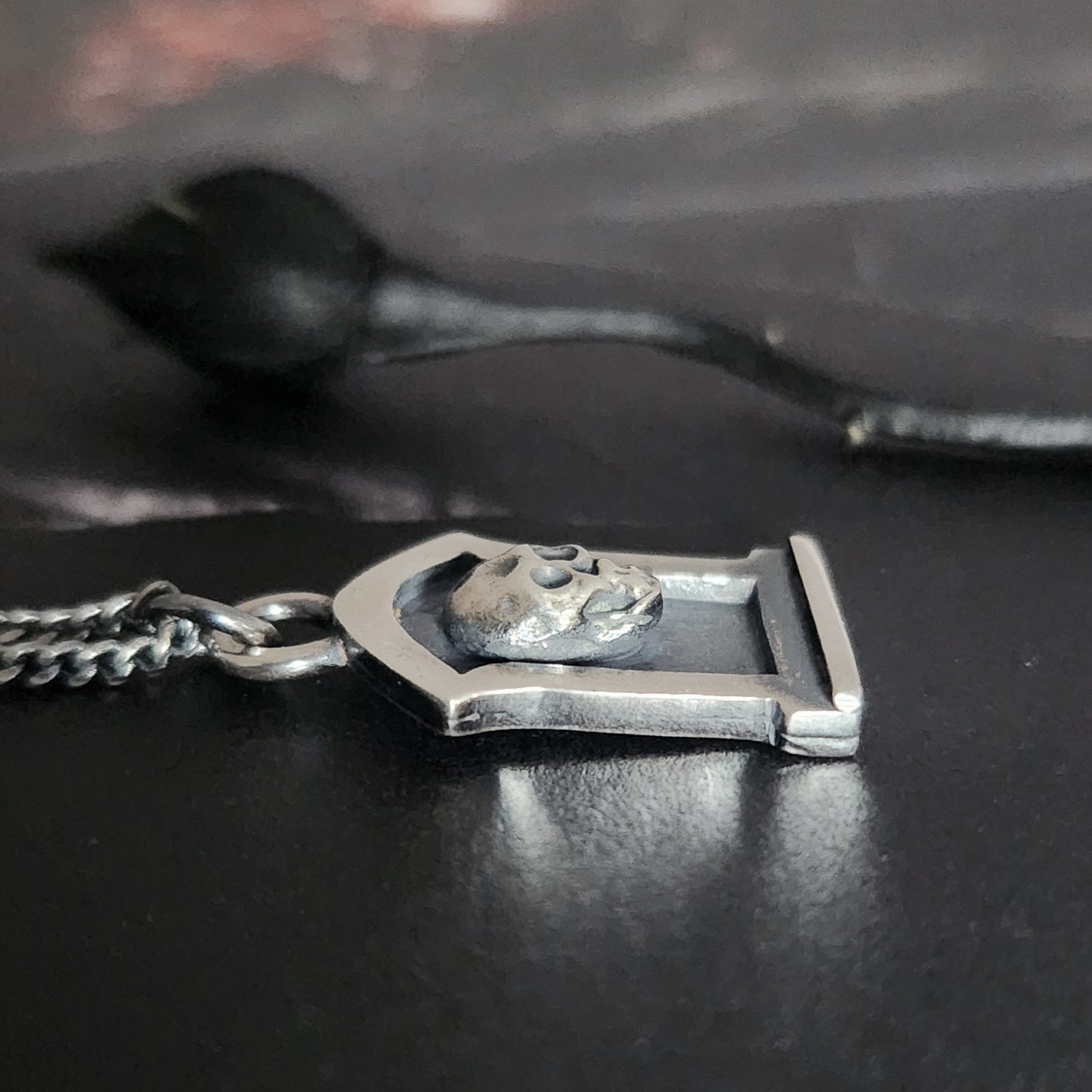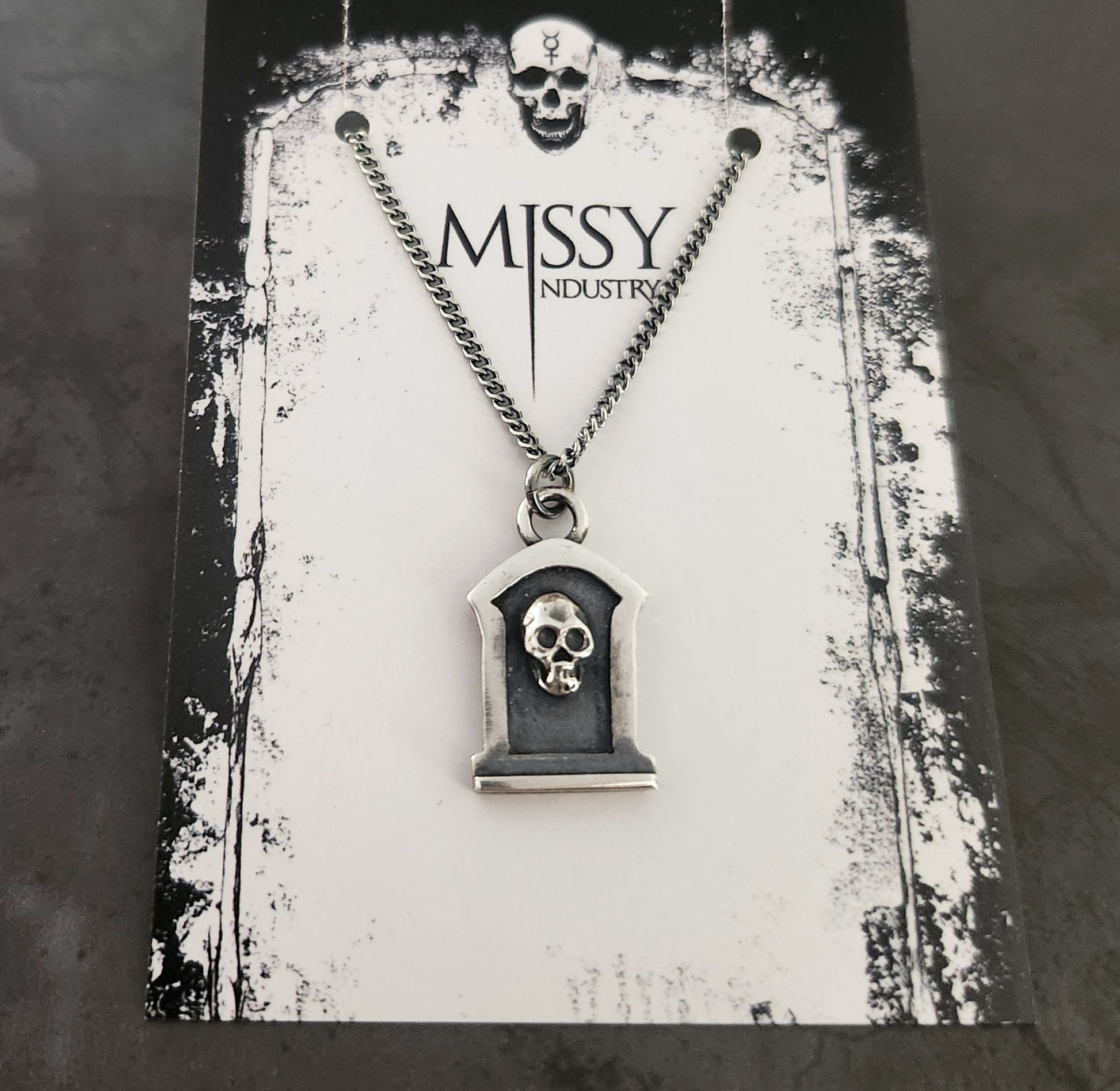 There are 2 versions of the Tombstone necklace and this listing is for the skull one.