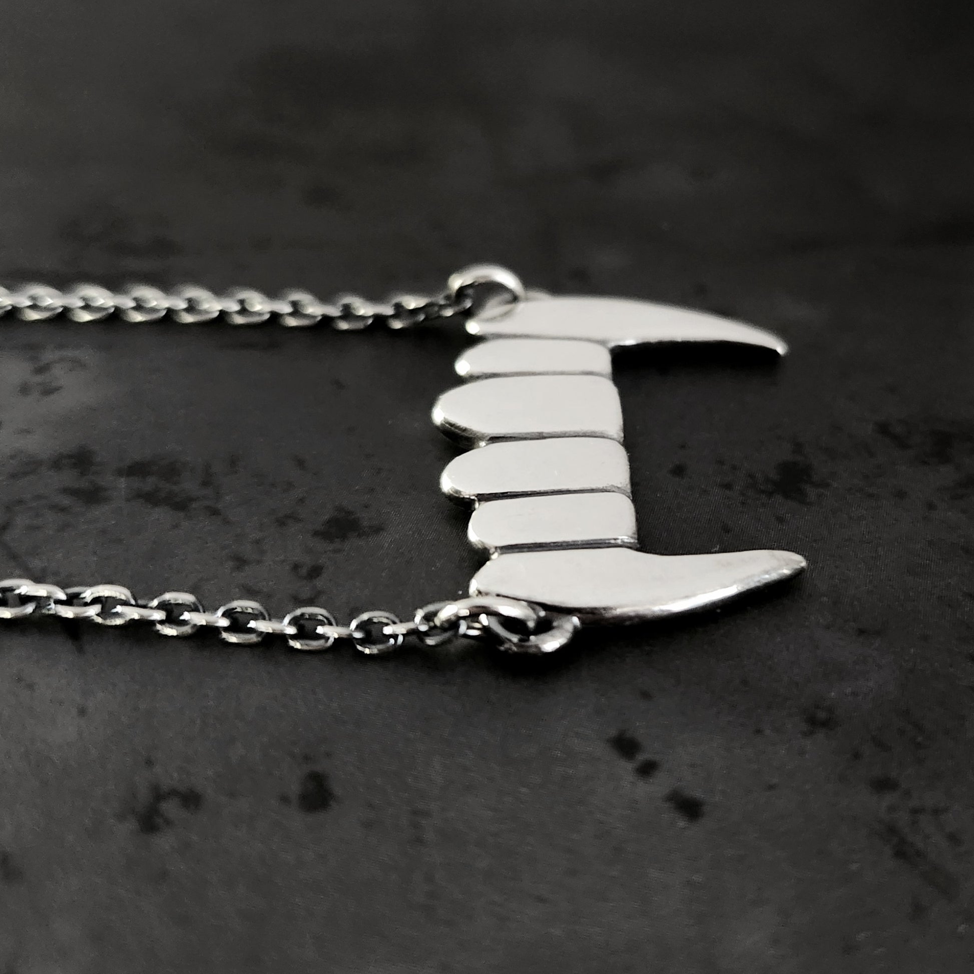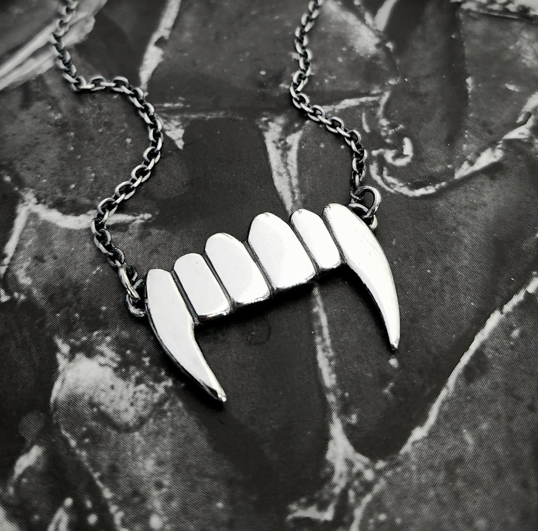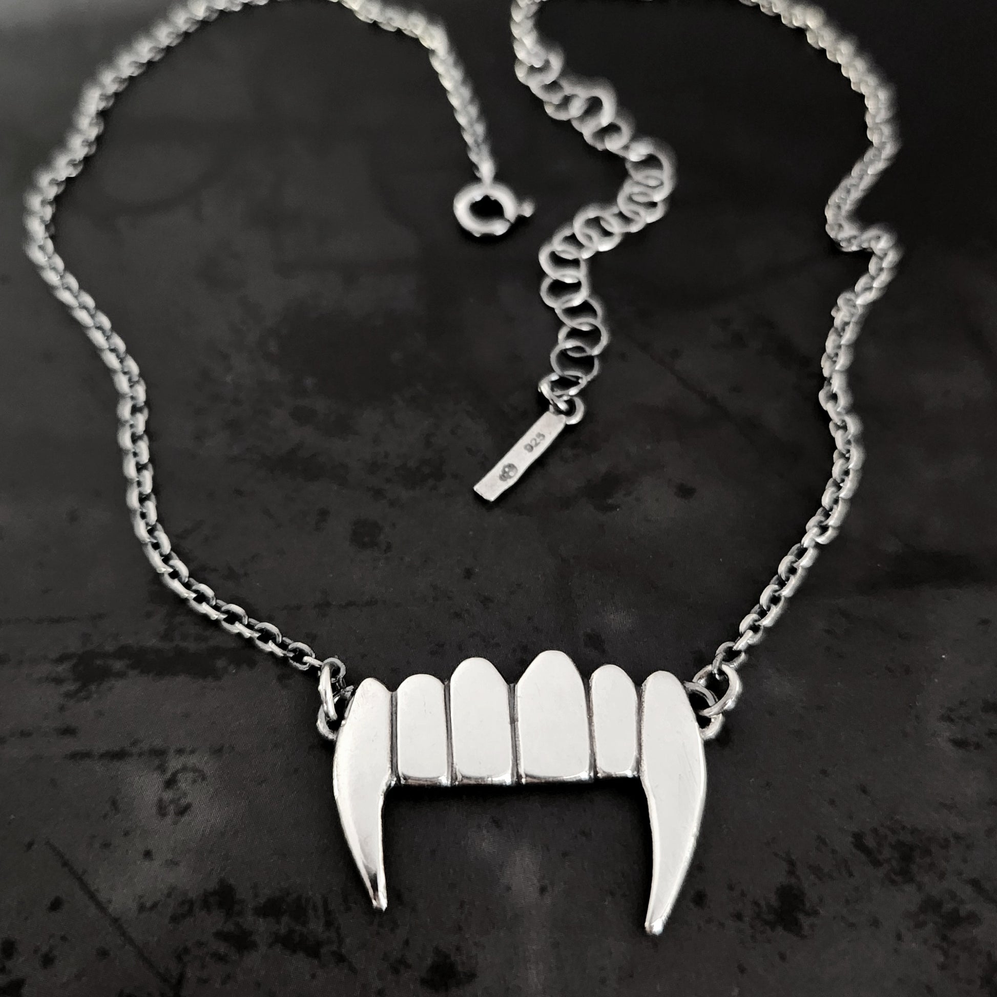 Sterling silver fangs measure 33mm wide and the longest canine is 23mm long. The back is smooth.