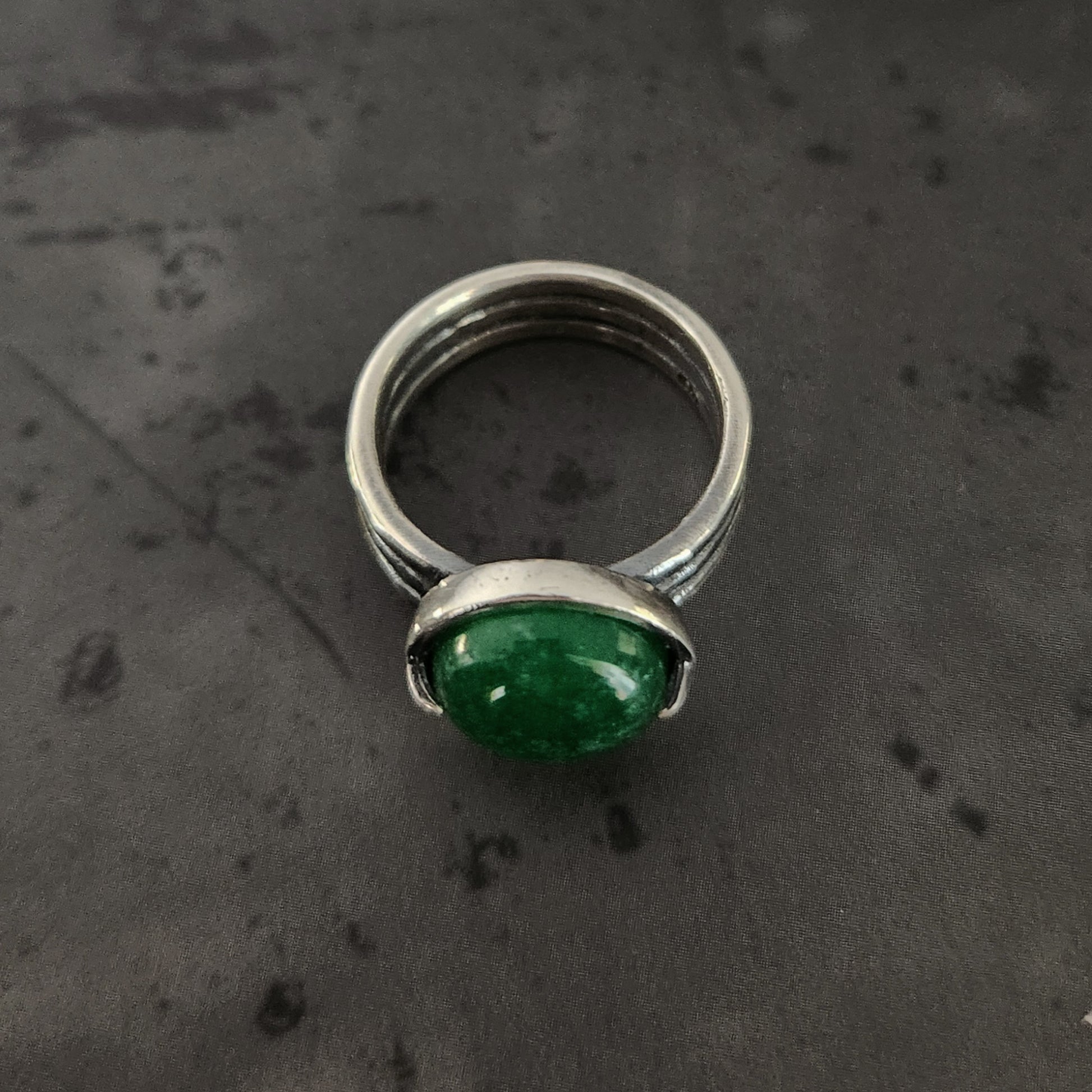 The 12 mm round cabochon is a bright green chrysoprase. It looks sweet like candy but also very poisonous!